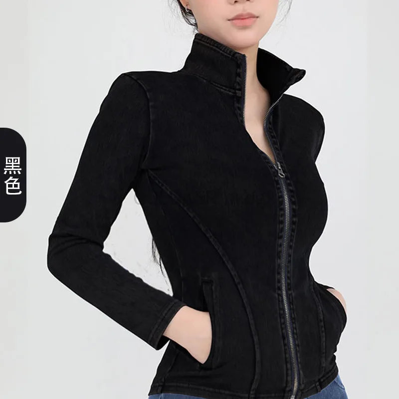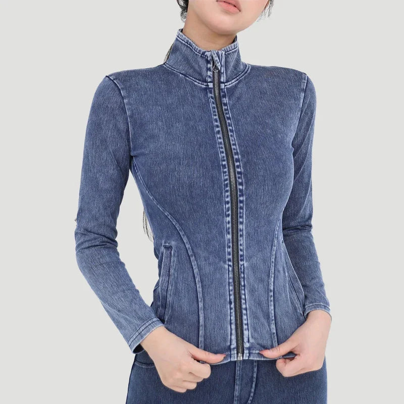 Introducing our Trendy Stretchy Denim Long Sleeve Jacket, crafted from luxurious nylon and SPANDEX for ultimate comfort and style. The solid pattern and turn-down collar exude an exclusive and sophisticated feel, while the full-length sleeves and zipper closure add a touch of functionality. Perfect for the fashion-forward woman looking for a versatile and slim-fit outerwear option.