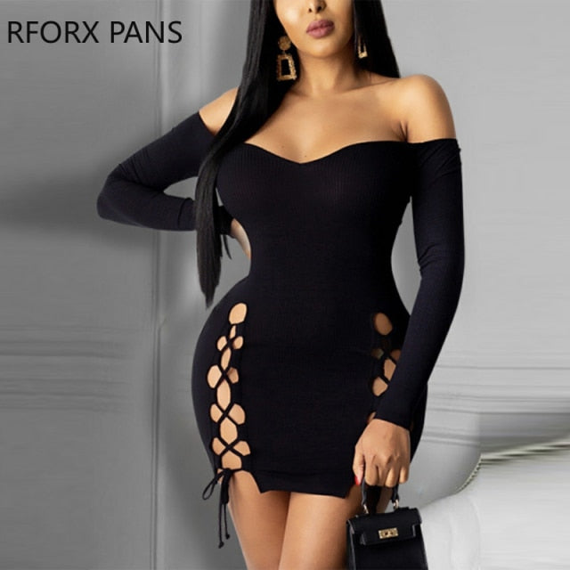 Trendy Hollow Out Low Shoulder Black Mini Dress