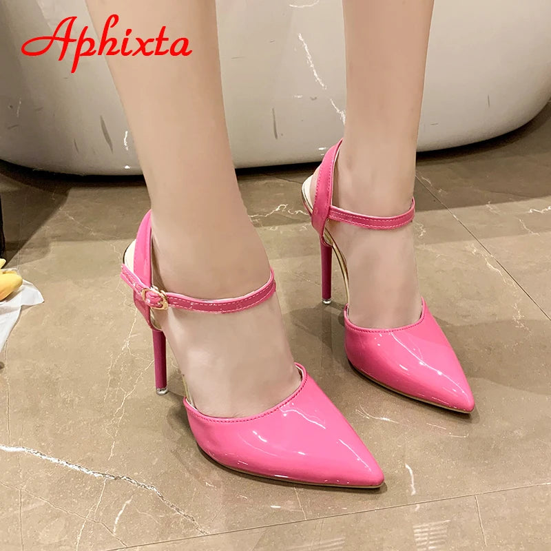 Indulge in the ultimate party accessory with our Trendy High Stiletto Ankle Strap Pointed Toe Heels! These modern sandals feature a super high heel for added height and a buckle strap for a secure fit. Made with patent leather and a solid color design, these heels are perfect for any occasion. Available in multiple colors and sizes.