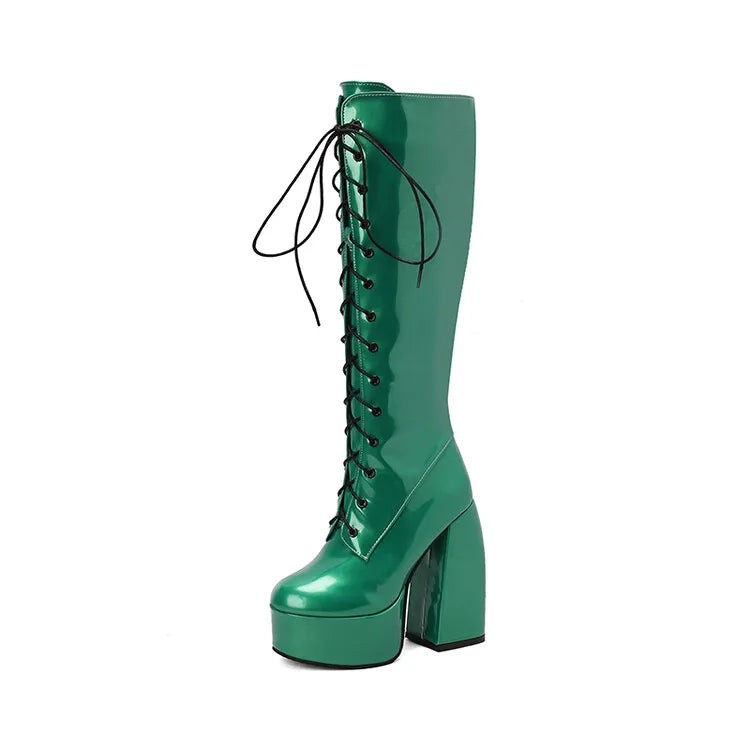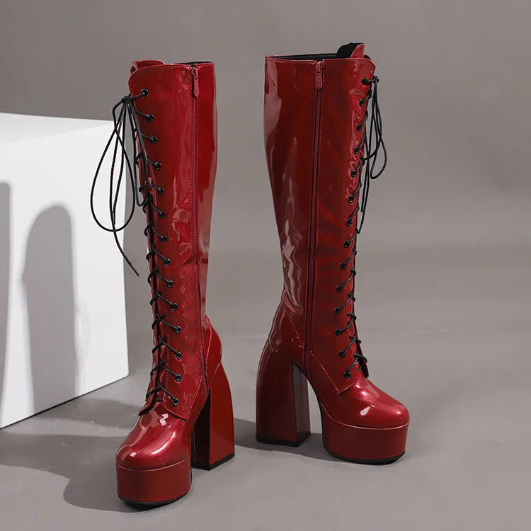 These sleek knee-high boots feature a glossy patent leather shaft and plush-lined interior for warmth and comfort. Equipped with a durable TPR outsole and a stable square heel, they offer both style and support, perfect for making a bold statement during colder days.