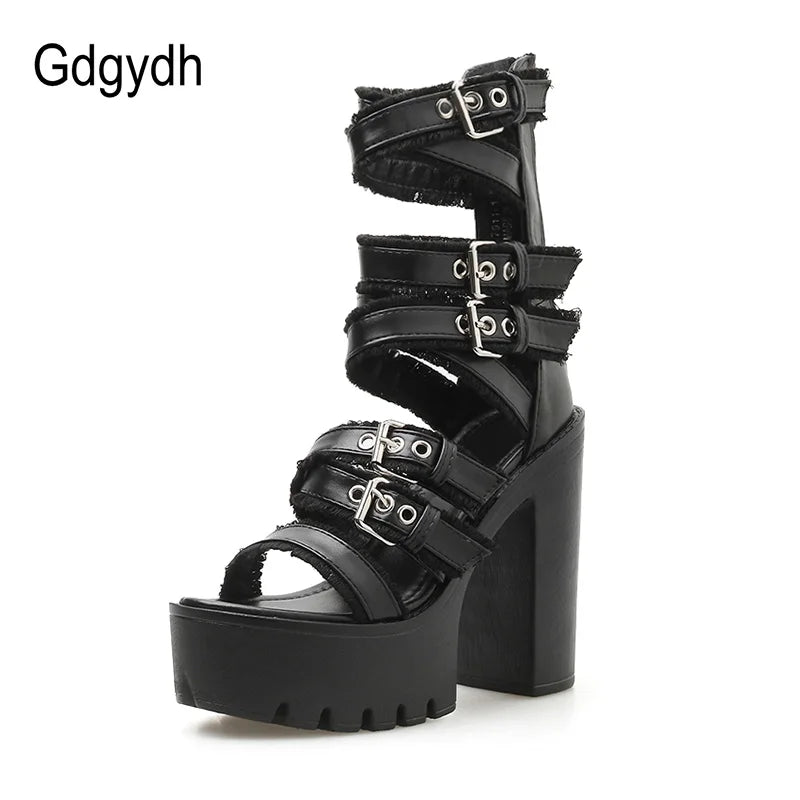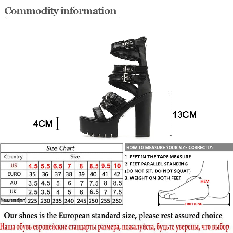 Black gladiator heels with a daring 13cm square heel and 4cm platform. Peep-toe, zip closure, and open side vamp for bold style. Made with PU material and rubber soles, perfect for parties, weddings, or edgy looks in spring through autumn. True to size and ready to turn heads.