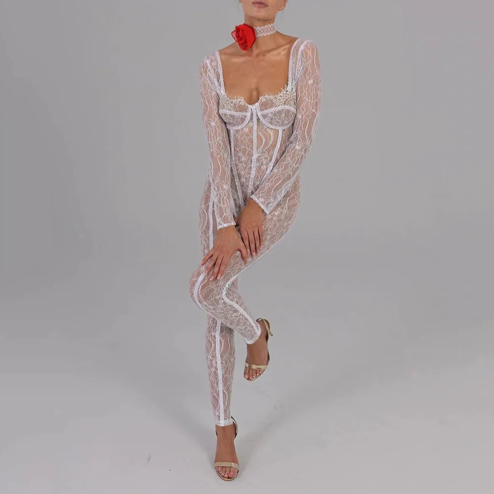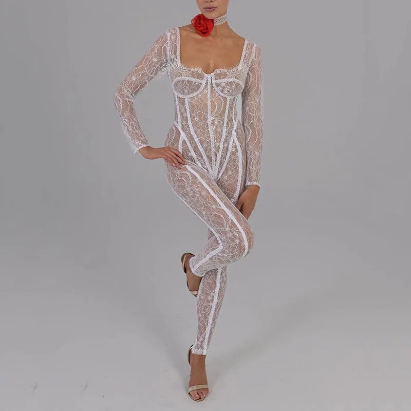 Trendy Mesh Lace Hollow Out Backless Jumpsuit