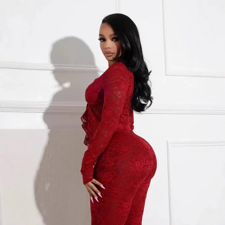 This fun, daring two-piece set includes a loose lace cardigan with pockets and a V-neck, paired with high-waist wide-leg pants featuring an elastic waist. Made from soft, slightly stretchy fabric for easy movement and comfort.