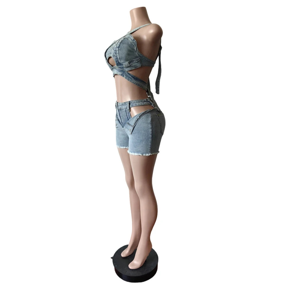 Trendy Denim Hollow Out Short Romper