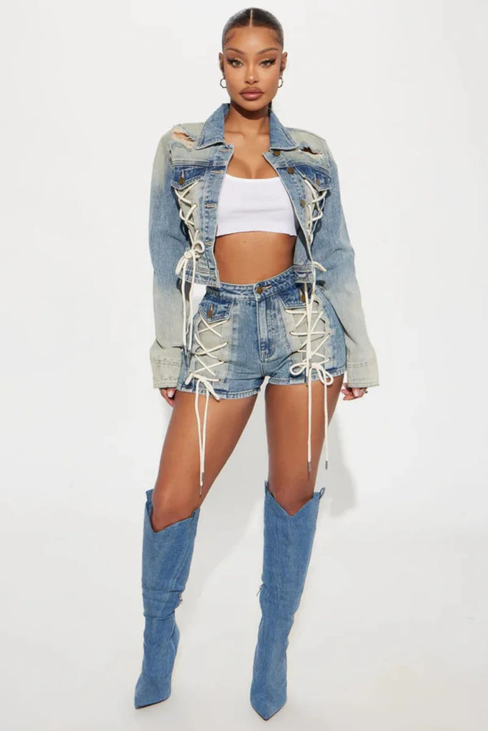This daring denim set pairs a fitted bandage crop top with a short jacket and matching shorts. Featuring a turn-down collar and lace-up details, it offers a slim, regular fit perfect for making a bold, casual statement.