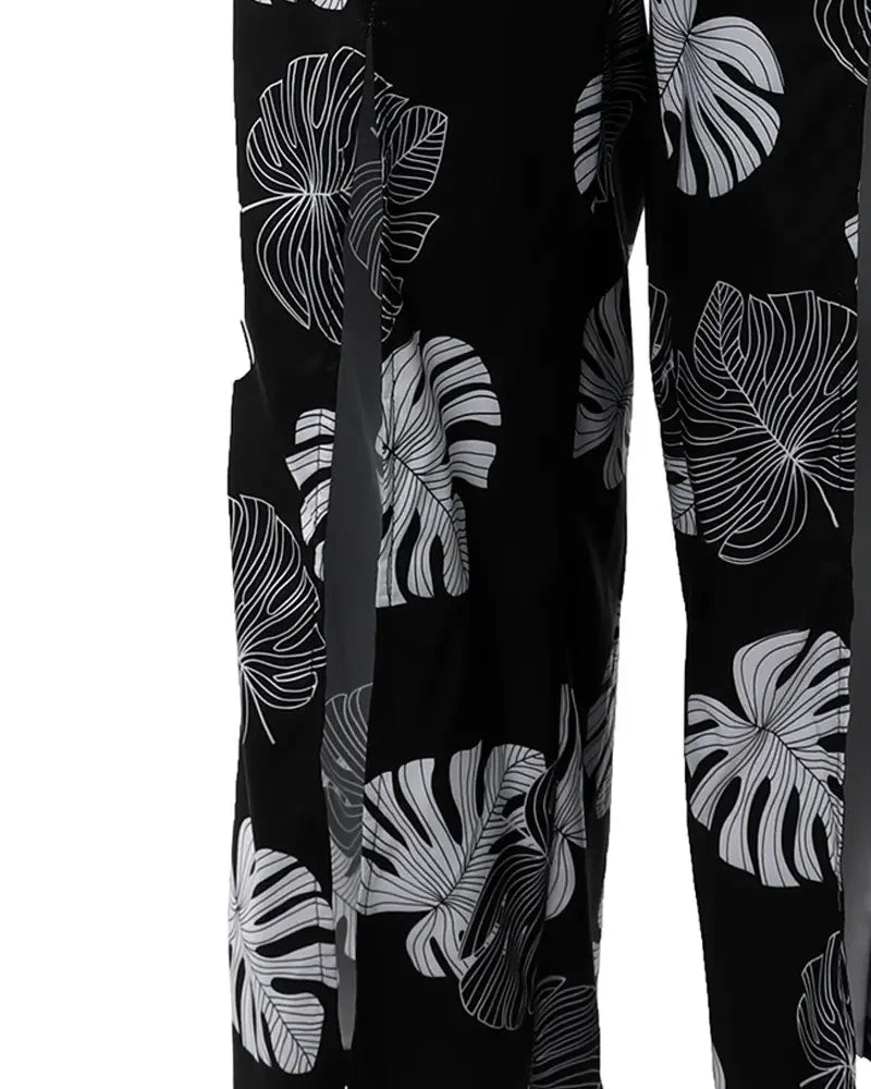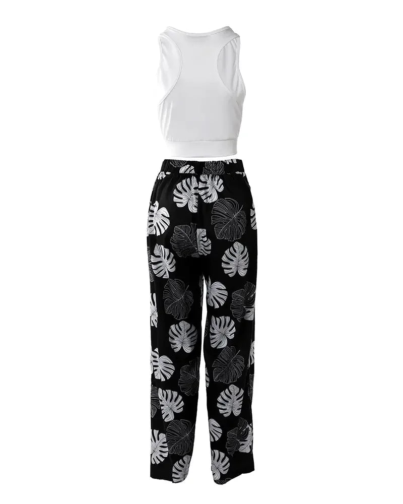 This bold summer outfit features a hollow white strapless crop top with a zipper and cool black-and-white floral split pants with an elastic waist. Made from soft cotton-polyester knit, it’s sleeveless and perfect for warm days. Designed for a slim, sheath fit, it blends comfort with daring style.
