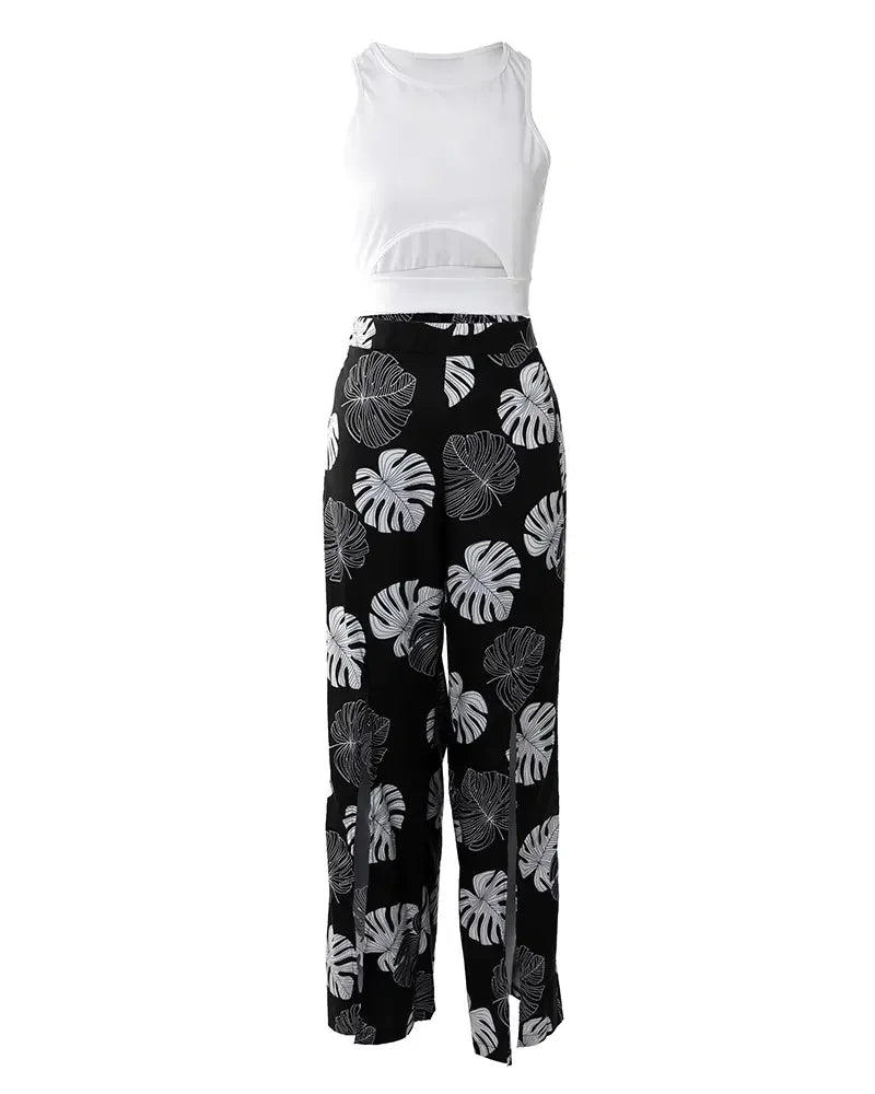 Trendy Hollow White Crop Top With Black/White Floral Split Pants