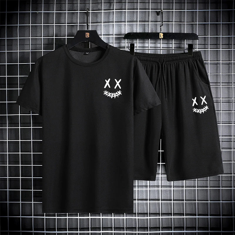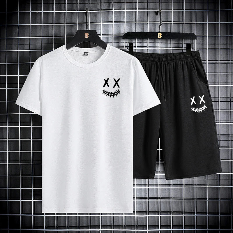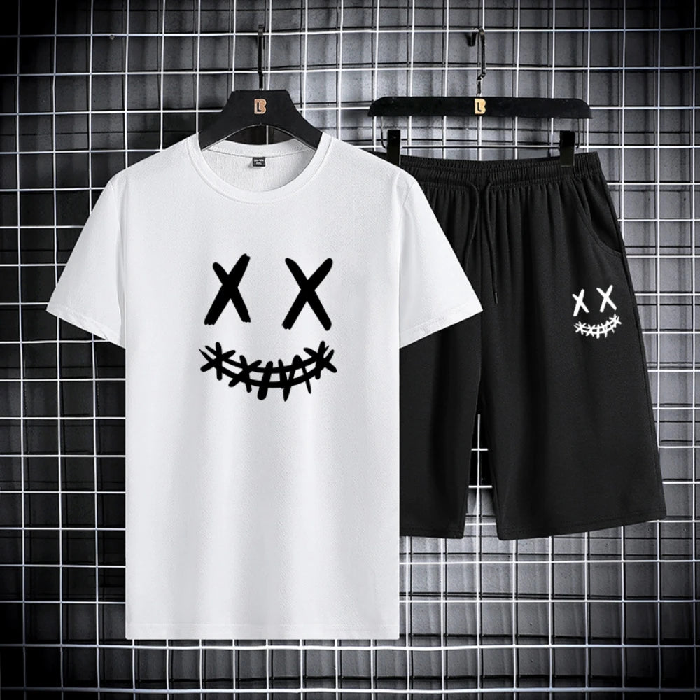 This men’s short sleeve graphic tee and shorts set blends style with comfort for casual summer wear. Lightweight and breathable, it features a knit fabric and elastic waist for easy movement. The bold printed design adds an edgy touch to your warm-weather wardrobe.