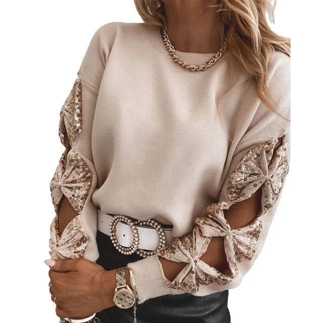 Trendy Sequin Bowknot Hallow Out Long Sleeve Shirt