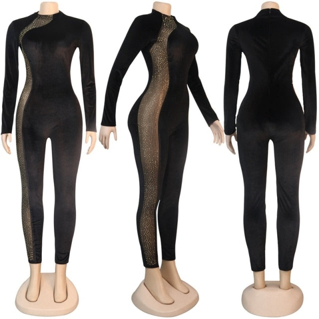 Trendy Velvet Mesh Rhinestone Jumpsuit