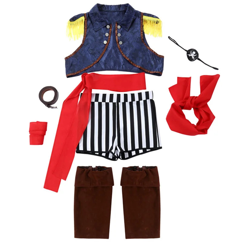 Command your ship with confidence and style in our Trendy Pirate Captain Halloween Costume. Made with high-quality polyester, this set includes a top, shorts, headband, eye mask, red cloth belt, belt, leg cover, and wrist strap. Perfect for any holiday or themed event, the only thing missing is your swashbuckling spirit!