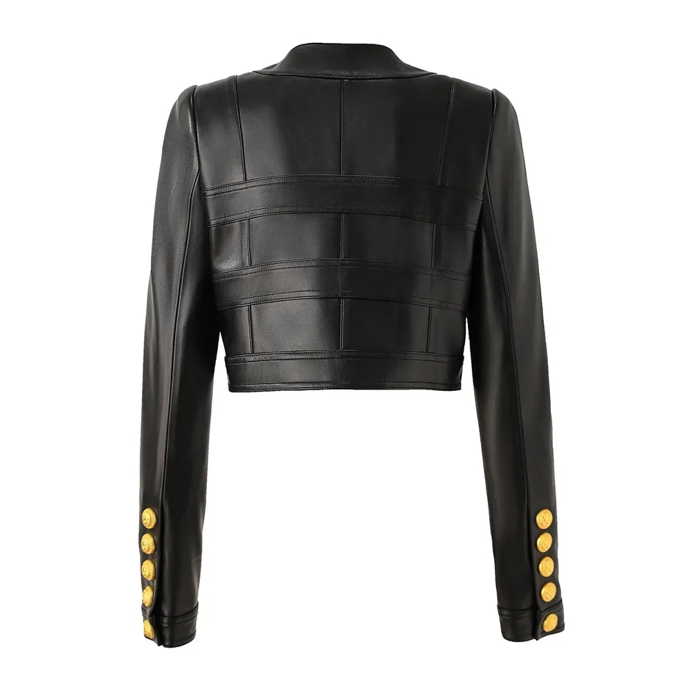Trendy Black Crop Leather Jacket With Gold Buttons