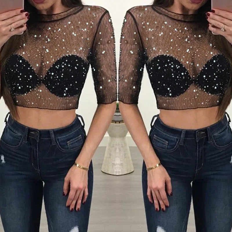 This fun and daring black crop top features sparkling sequins and sheer mesh for a bold look. With a slim fit, short sleeves, and a flattering crop length, it’s perfect for making a statement anytime.