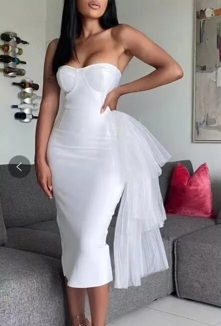 Be the life of the party in this Trendy Bandage Mesh Strapless Party Dress! It features a slim fitting silhouette, natural waistline, and a stunning strapless neckline with zippers to add a subtle but elegant touch. Crafted with high-stretchy Polyester and Spandex fabric for a comfortable and flattering fit, this dress is sure to make you feel pretty and confident.