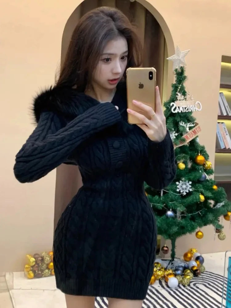Introducing our trendy fur hooded knitted mini party dress, perfect for a night out with your partner. Its long length and thick material will keep you warm during the colder months while its slim fit and solid pattern adds a touch of sweetness to your style. Made with polyester and acrylic for a slight stretch, it's designed to set you apart from the crowd. Dress to impress with this luxury piece.