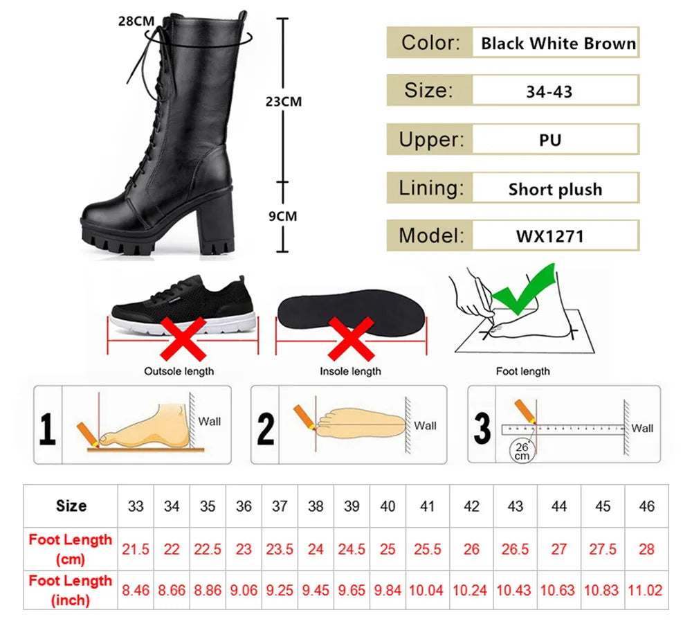 Dominate winter in these mid-calf lace-up boots with a bold 9cm square heel and thick rubber sole. Designed in durable PU with cozy plush lining, they keep you warm while making a fierce statement. Available in black, white, and brown, these true-to-size boots are your go-to for edgy, cold-weather style.