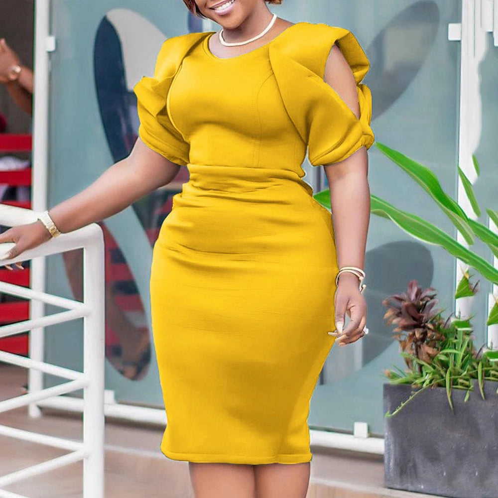 This sleek sheath dress features a flattering hollow-out design and solid color that works year-round. The short sleeves and empire waistline create a polished silhouette perfect for any season. Made from polyester with slight stretch for comfort, it's available in sizes S to XXXL with lengths ranging from 33 to 42 inches.