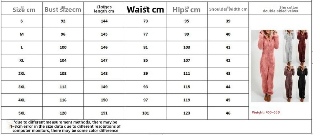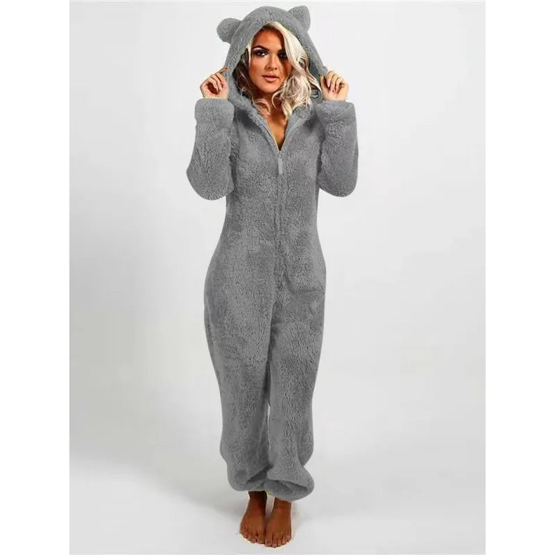 Cozy plush hooded jumpsuit perfect for lounging and sleeping. Crafted from soft polyester knit with full sleeves and your choice of V-neck or O-neck collar. Available in multiple colors including red, black, pink, gray, blue, and purple. Features an elastic, breathable design ideal for cooler seasons. Sizes S to 5XL for the perfect fit.
