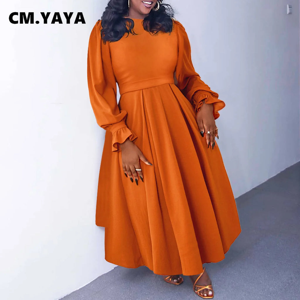This flowing plus-size maxi dress combines a loose fit with elegant pleats for a playful yet comfortable look. With long sleeves and an empire waist, it’s perfect for making a bold statement while staying cozy.