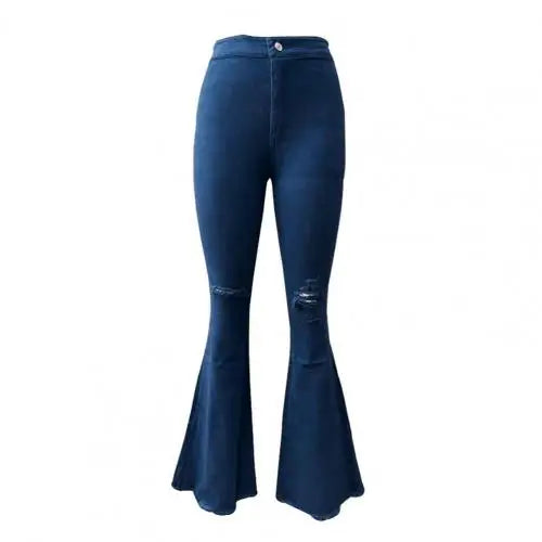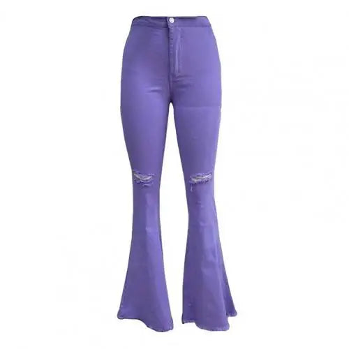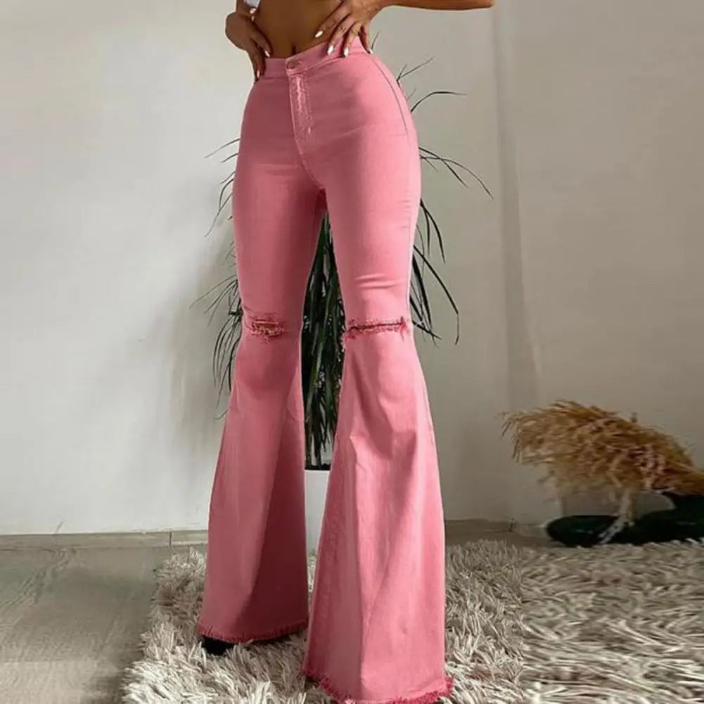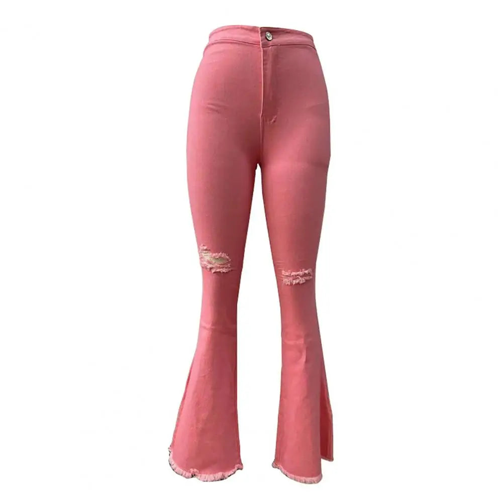 Get on-trend with our Trendy Ripped Flared Fringed Pants! Made with a comfortable blend of cotton and spandex, these full-length pants feature a slight stretch for the perfect fit. The coated fabric adds a stylish touch, while the washed decoration gives a worn-in look. Perfect for women ages 25-34, these regular fit casual pants have a zipper fly for ease of wear and a flattering mid-waist design. Upgrade your wardrobe with these must-have women's jeans!